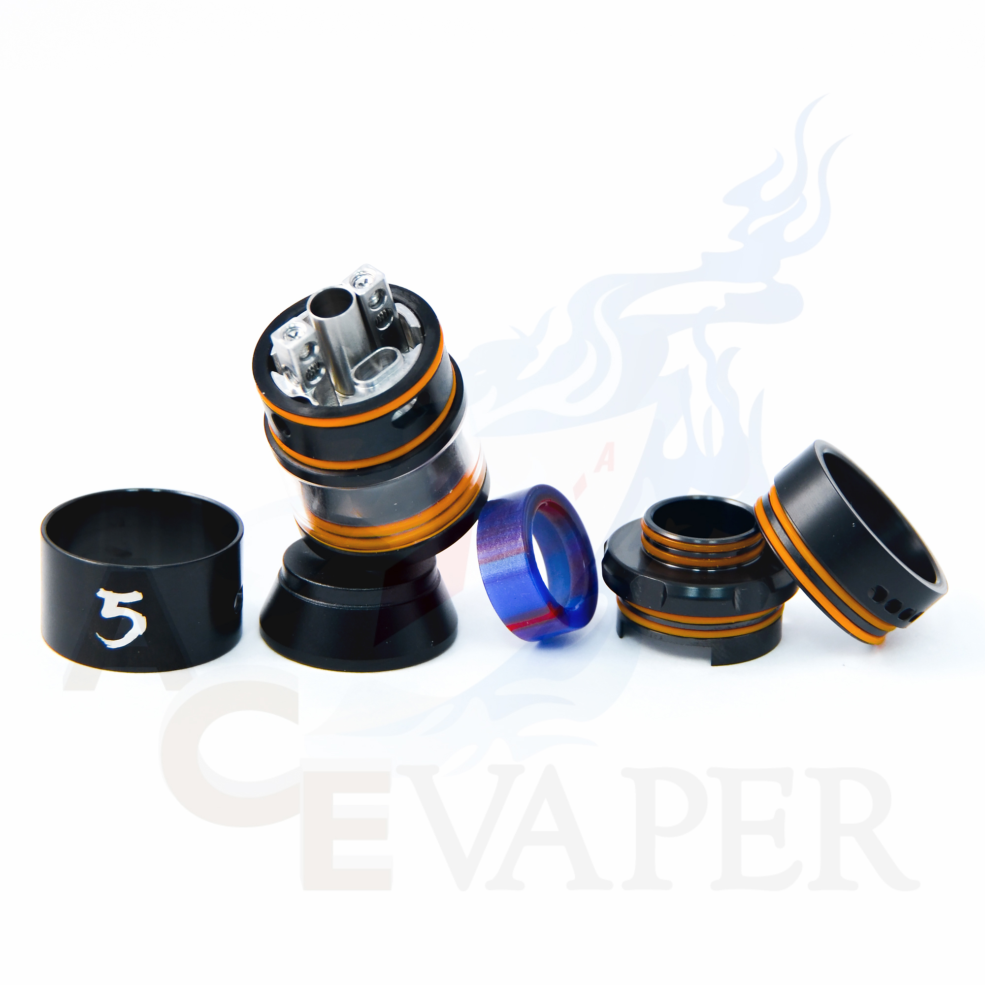 Airflow has been upgraded on the RDTA5 with both bottom and side air intakes. On the base, you will see 2 x five adjustable air holes while dual adjustable air slots on the chuff cap provide side airflow.