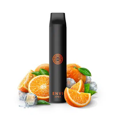 Orange Iced Envi Apex is a disposable vape pod system powered by 1100 mAh battery and housing 6mL internal vape cartridge allowing approximately 2500 puffs per device.