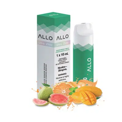 Orange Mango Guava Allo Ultra 2500 20 MG compact disposable vape with 10ml e-liquid capacity with excellent flavor experience via mesh technology from Allo Vapor.