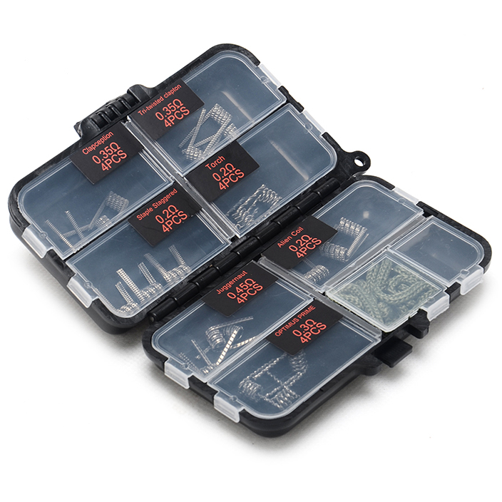 The coil box has 9 separate closing compartments to store your coils. Comes with 28 different coils.